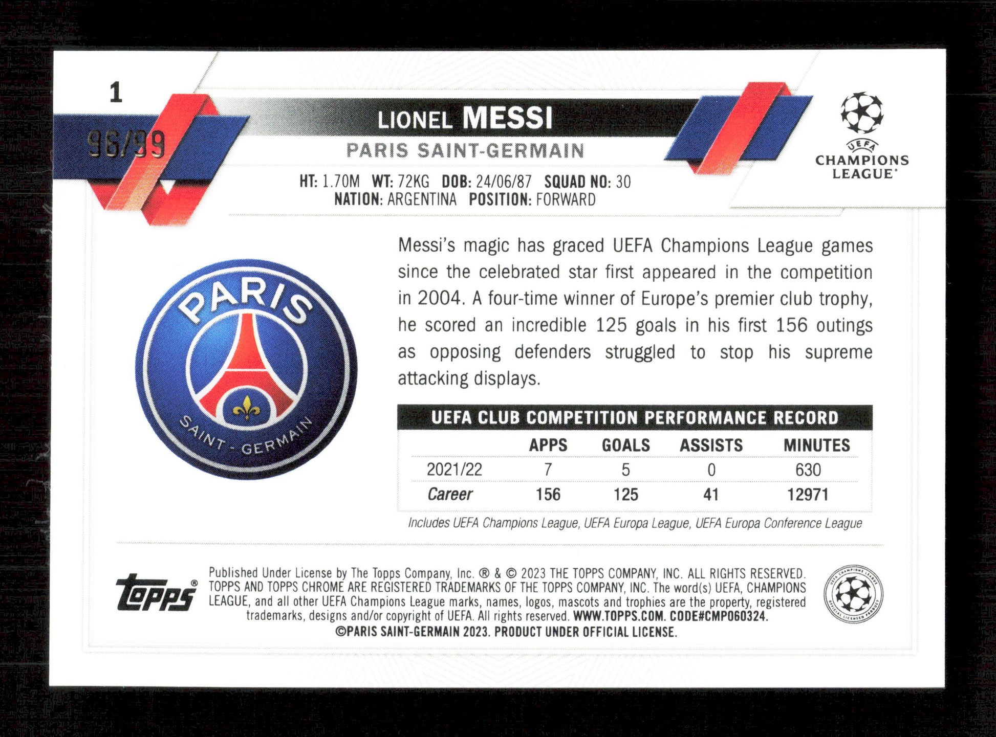 Topps Lionel messi Yellow Parallel Card /99 Chrome Sapphire UEFA Champions League 2023 #1