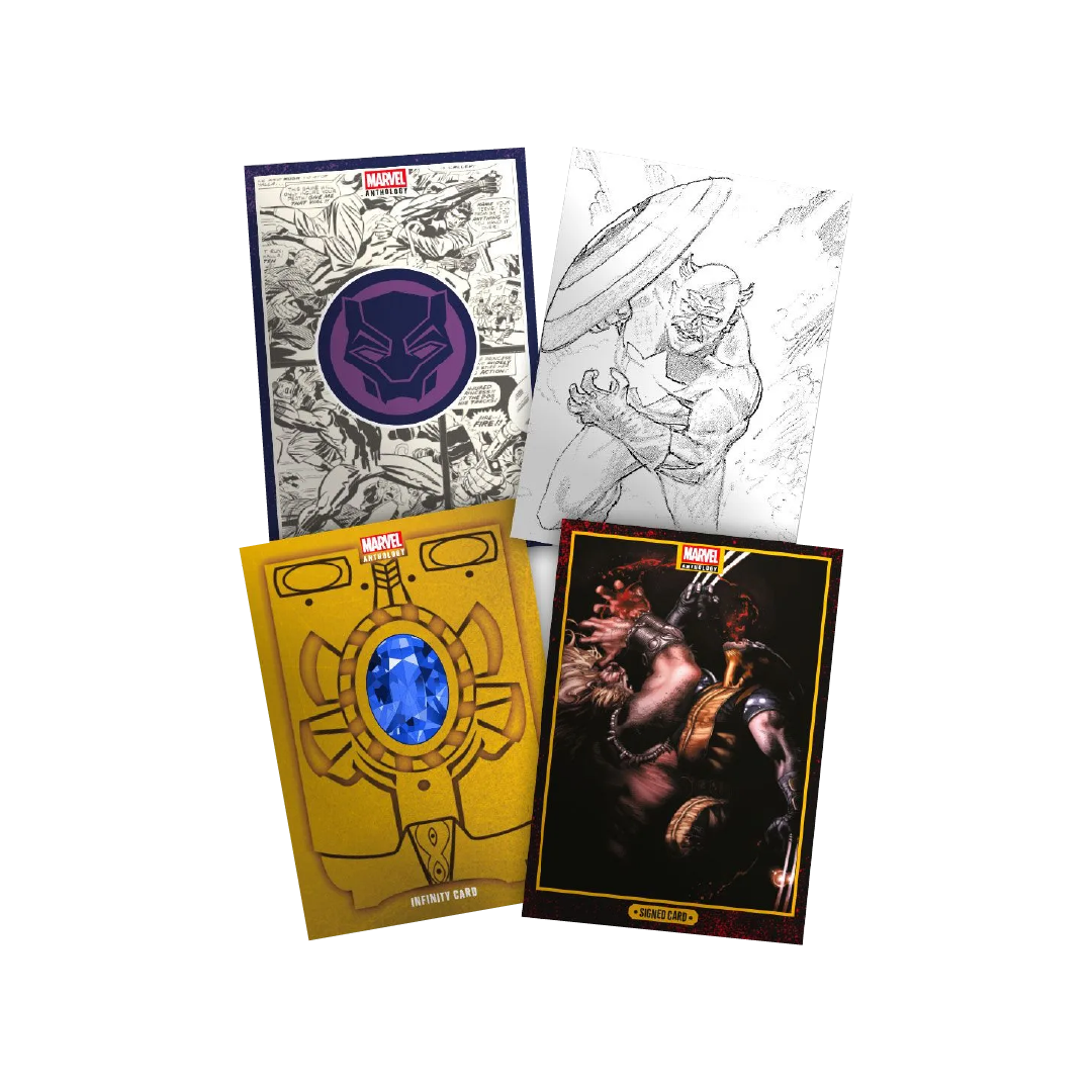 • 147 Memorabilia Cards, extremely rare and valuable, across four categories: Infinity, Badge, Signed (autographed by artists such as Simone Bianchi or John Romita Jr), and AUTHENTIC Sketch Cards, hand-drawn and signed by the artists themselves. One Memorabilia card is guaranteed in every box!