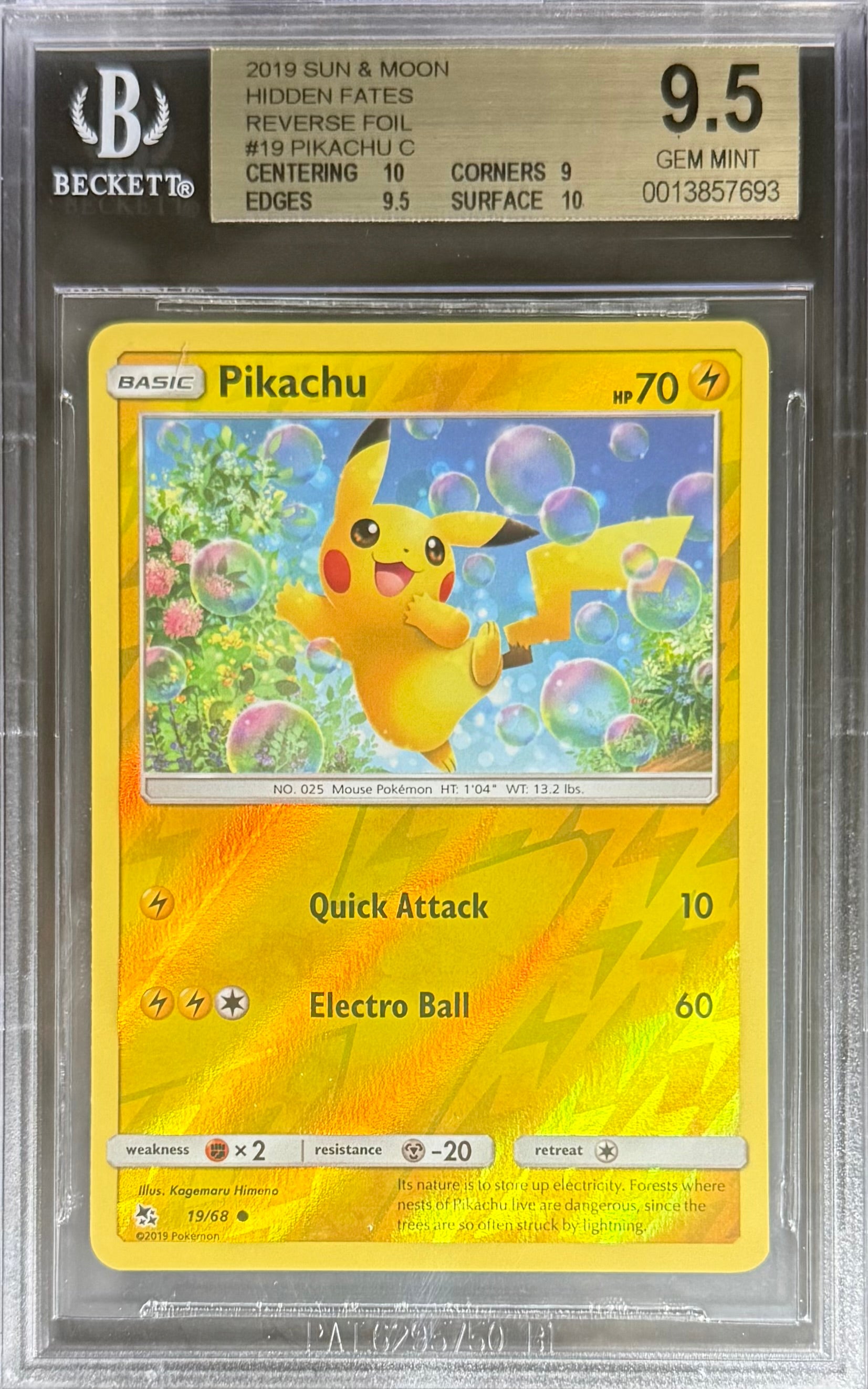 Pokemon Pikachu C 19/68 Reverse Foil Pokemon Sun & Moon Hidden Fates 2019 Beckett BGS 9.5