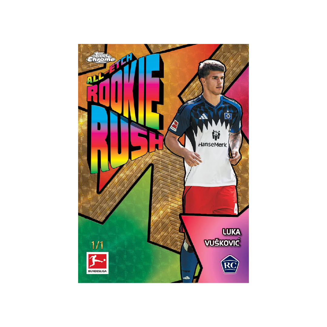 Topps Chrome® Bundesliga returns with a completely new design and a host of new players, featuring many of the biggest stars in European football alongside rising talents and rookies. The Topps Chrome® Bundesliga base set, printed entirely on Chrome® technology. Rookie Cards are clearly designated with RC markings across base cards and parallels. Among this season’s rookies already making waves are Lennart Karl, Luka Vušković, Yan Diomande, and Saïd El Mala.